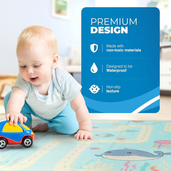 - Double-Sided Durability - Our foldable activity mat boasts a double-sided design, offering twice the fun and functionality. One side features a colourful and engaging playtime pattern, while the other side offers a sleek and sophisticated design, suitable for picnics and family gatherings.